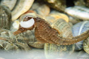 正確にはタツノオトシゴの仲間である「サンゴタツ」という種類です。うちで飼育している個体に比べると二回りぐらい大きく、ずいぶんと貫禄があります。水温が下がったのでとっくに浜名湖からいなくなったと思っていたのですが、暢気なやつもいたもんです。持ち帰って浜名湖水槽に入ってもらうことにしました。ちなみにこの日の水温は12℃ほどでした。